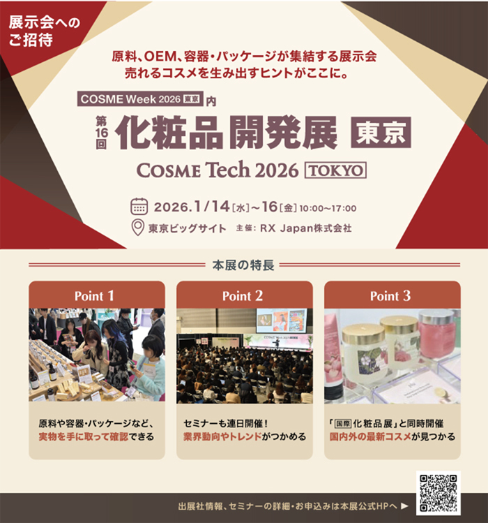 新着情報NEWS ALL 2025 2024 2022 2020 2018 2017 2016 2025/12/03 第16回 化粧品開発展に出展いたします。 ◇第16回 化粧品開発展[東京]に出展いたします! 会場:東京ビッグサイト ブース番号:[26-2] ●入場用バッジ登録フォームはこちらからご登録いただけます。 (※外部リンク飛びます) 新着お知らせ一覧へ戻る
